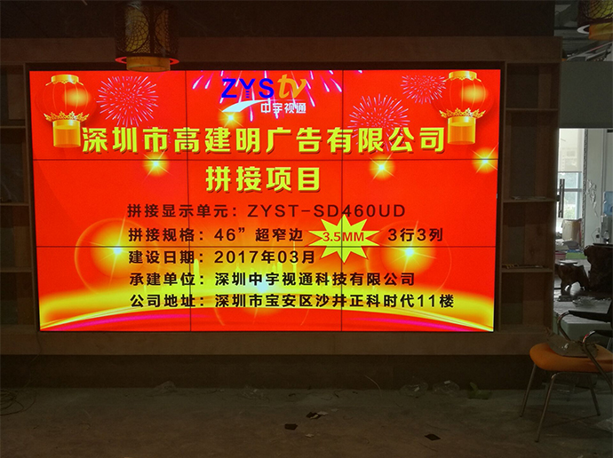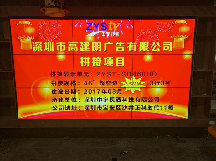 拼接項(xiàng)目:深圳市高建明廣告有限公司拼接單元:ZYST-SD460UD拼接拼縫:3.5mm拼接規(guī)格:3*3拼接尺寸:46寸拼接屏安裝方式:壁掛承建地址:深圳市高建明廣告有限公司承建日期:2017年3月承建單位:深圳中宇視通科技有限公司