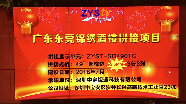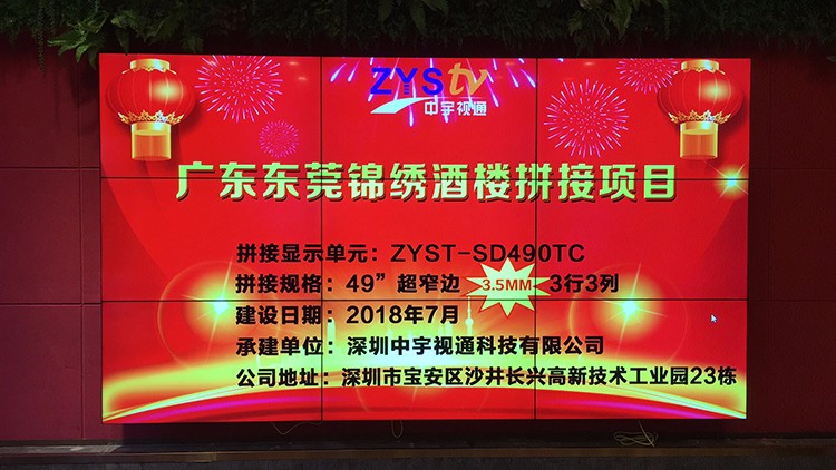 廣東東莞市錦繡酒樓選用深圳中宇視通科技49寸3.5拼縫拼接屏項目安裝調(diào)試完成且順利通過驗收。