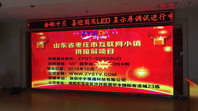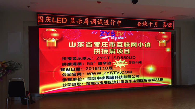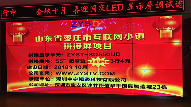 山東棗莊市互聯網小鎮55寸超窄邊3.5mm3行4列液晶拼接屏項目,安裝調試完成并且順利驗收,中宇視通科技全體職工從深圳發來賀電!