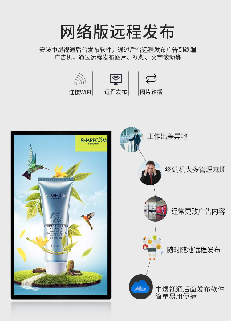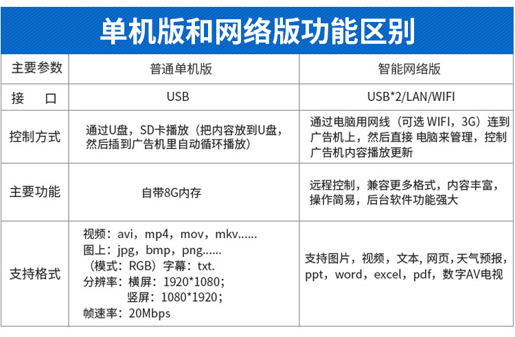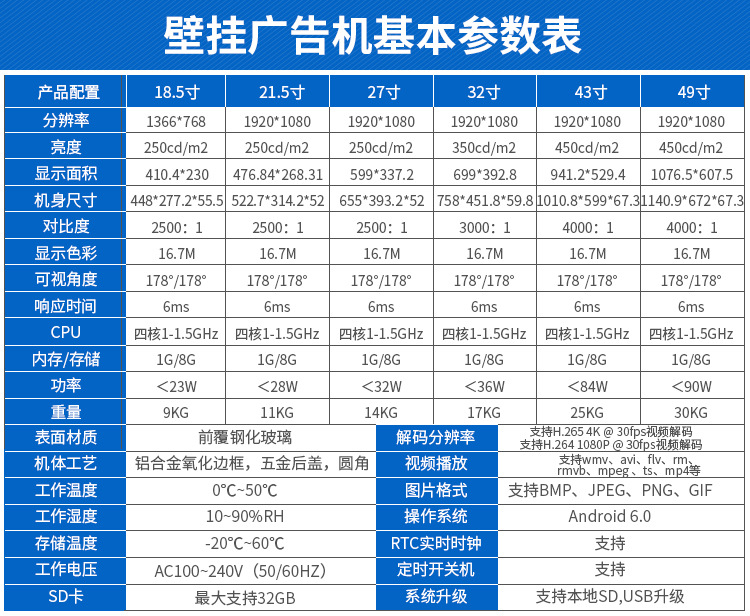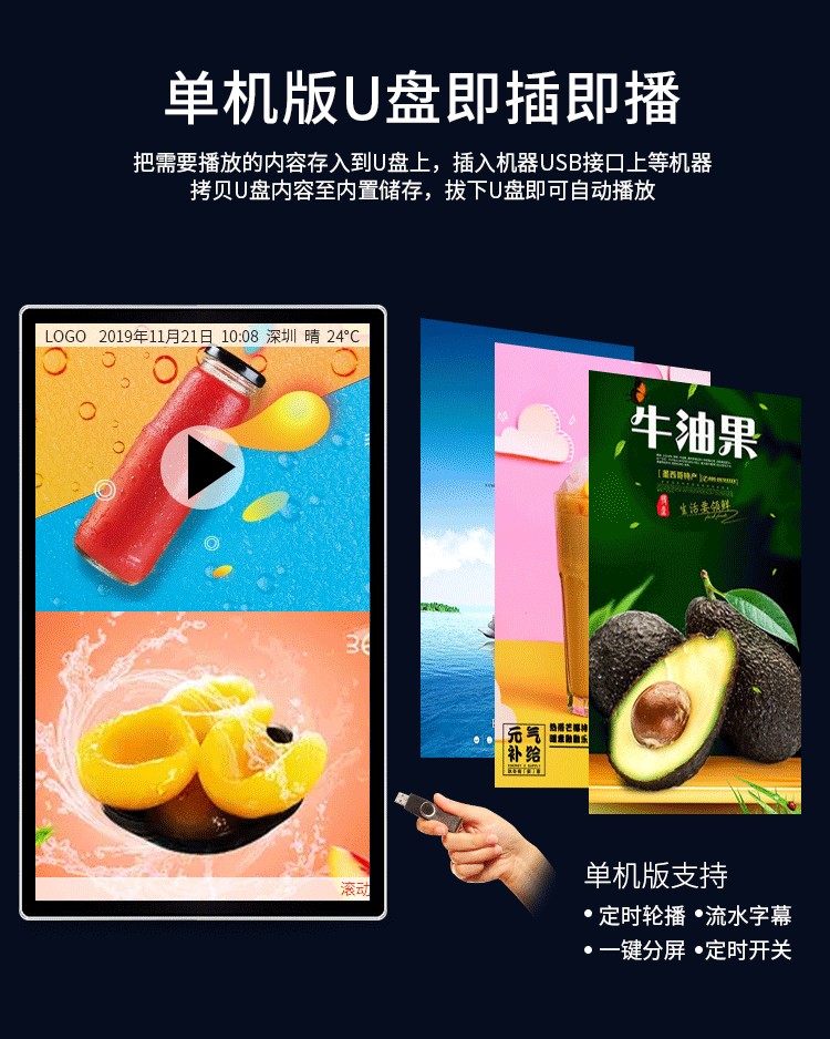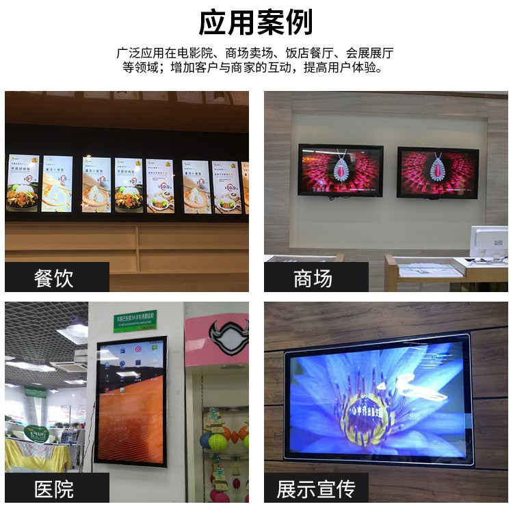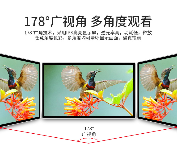18.5寸壁掛廣告機采用專業級工業液晶屏,視頻圖像展現清晰、自然,能夠更好的表現廣告細節;機身設計外觀時尚、大方,超薄,使用方便、美觀,采用全新環保技術,穩定性好,能夠適應并在惡劣環境中正常工作。正常使用情況下,可達60000小時以上的超長的使用壽命,并且能夠7*24小時不間斷工作。目前,液晶廣告機憑借優良的顯示性能,已經成為人們認同的理想的“第五大媒體”顯示設備。
