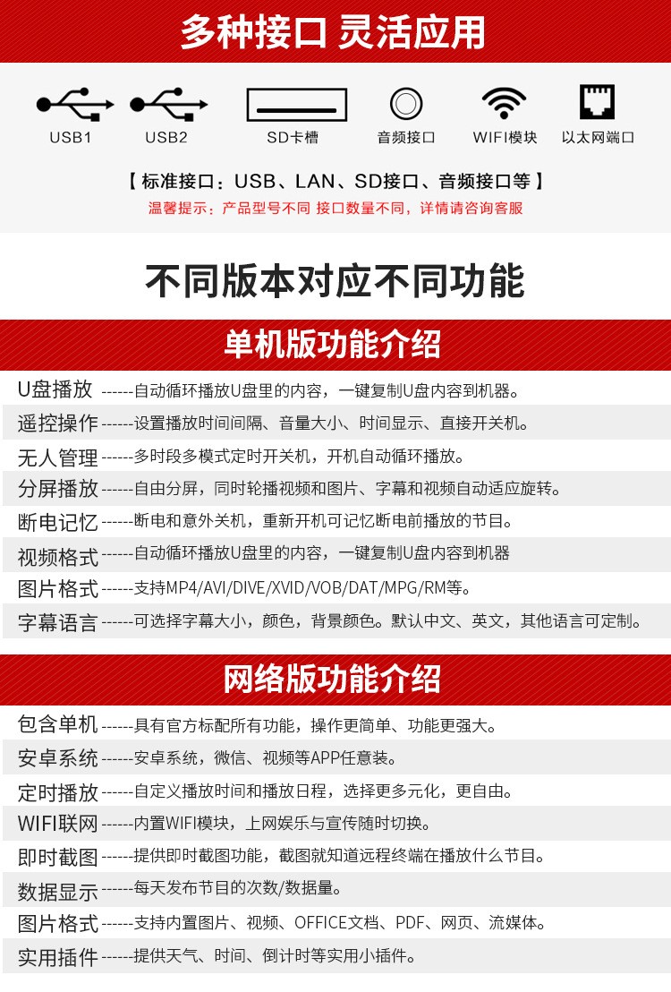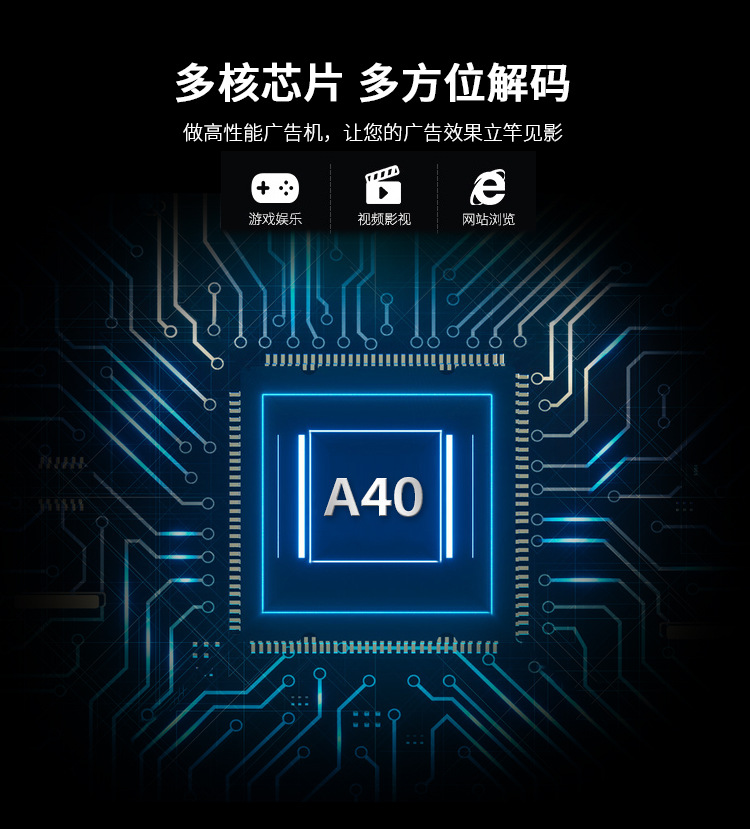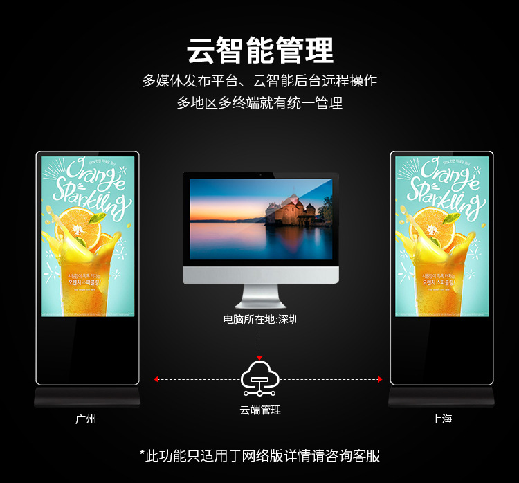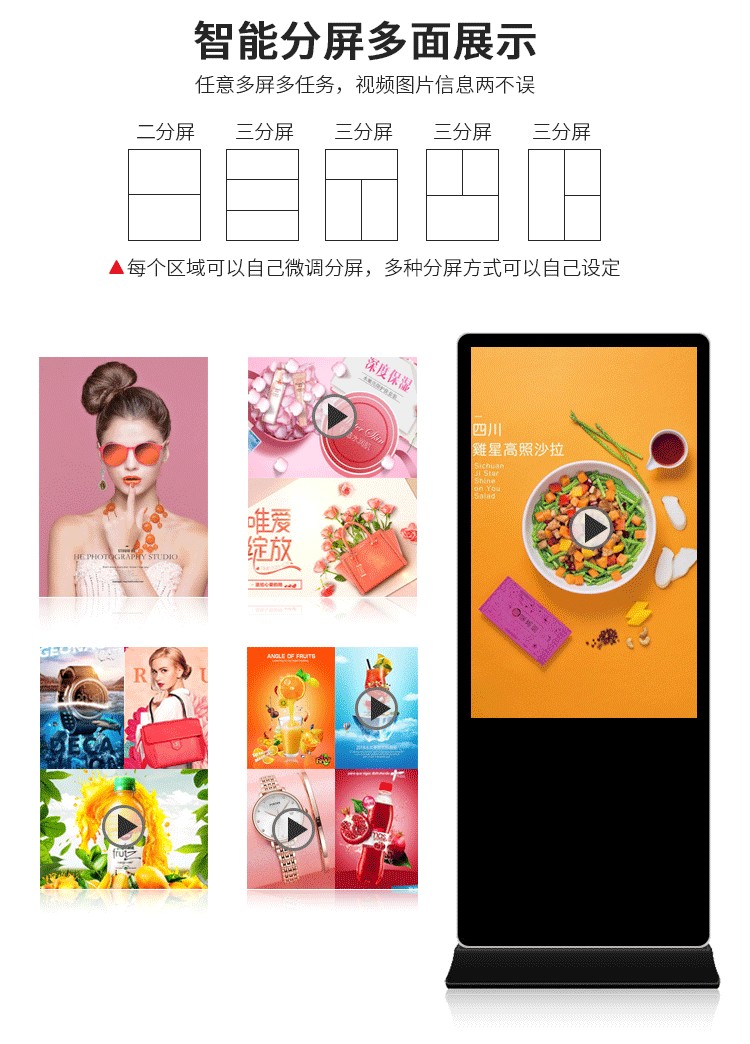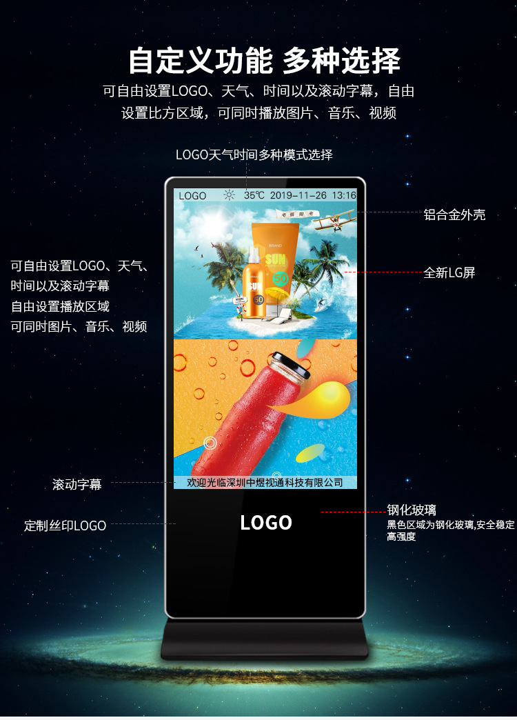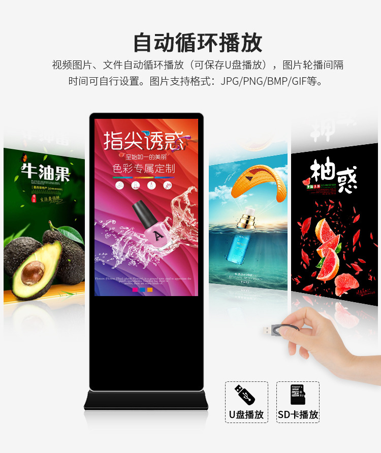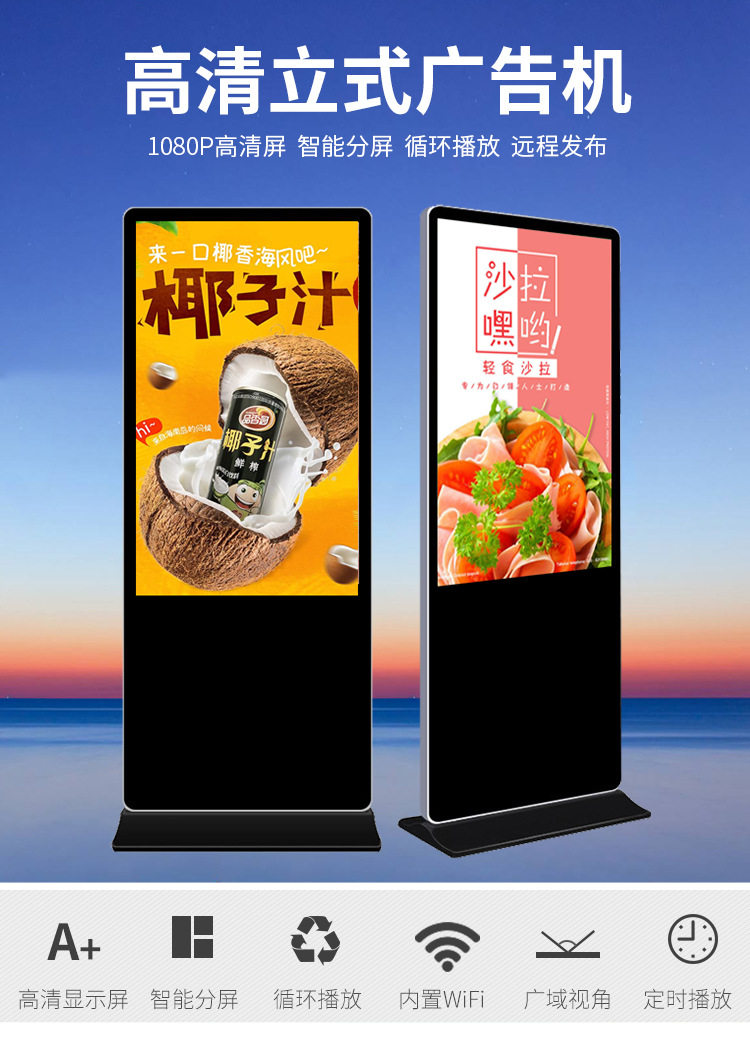 50寸立式液晶廣告機(jī)系列產(chǎn)品屬于壁掛、落地式數(shù)字標(biāo)牌廣告機(jī),外觀優(yōu)美,全身五金冷軋鋼板噴涂,邊條鋁合金型材,面板4MM專用鋼化玻璃,橫式16:9液晶屏,高清效果。內(nèi)屏采用三星、LG原裝工業(yè)級(jí)液晶屏,配以最先進(jìn)的密集型LCD光源背光系統(tǒng),背光色彩還原度好,超高對(duì)比度,強(qiáng)光下依然清晰無比。特別適合高端品牌的綜合多媒體技術(shù),向消費(fèi)者傳遞全方位的產(chǎn)品信息,促銷信息等。提升產(chǎn)品在銷售終端的顯現(xiàn)率和陳列效果,刺激沖動(dòng)性購買。相比于其他傳統(tǒng)媒體和促銷方式,投入極低廉,性價(jià)比極高。